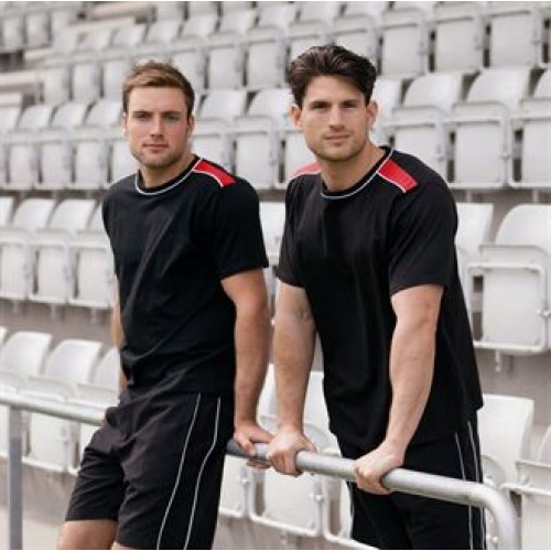 Crew neck T with contrast panel on shoulder, contrast piping round neck and along shoulder panel.